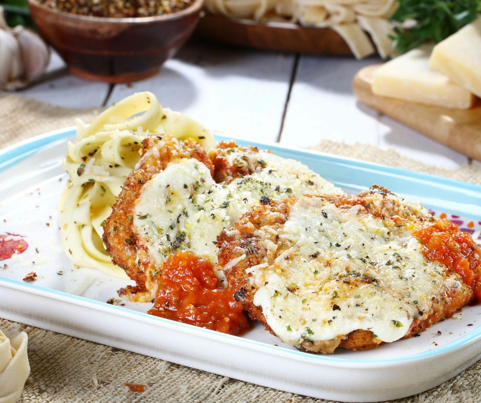 Breaded with almond flour and parmesan, baked chicken breasts are topped with marinara and melted mozzarella. Serve with zucchini noodles for a complete Italian-inspired dinner.