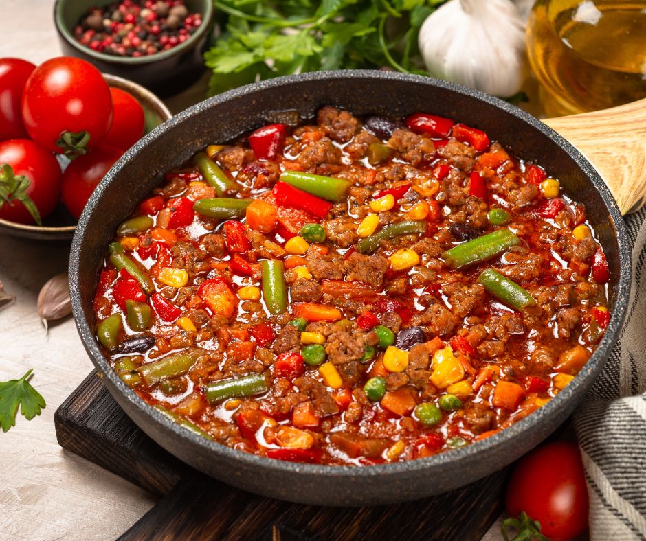 Hearty ground beef chili made with tomatoes, peppers, and spices—minus the beans. Perfect for a cozy September night.